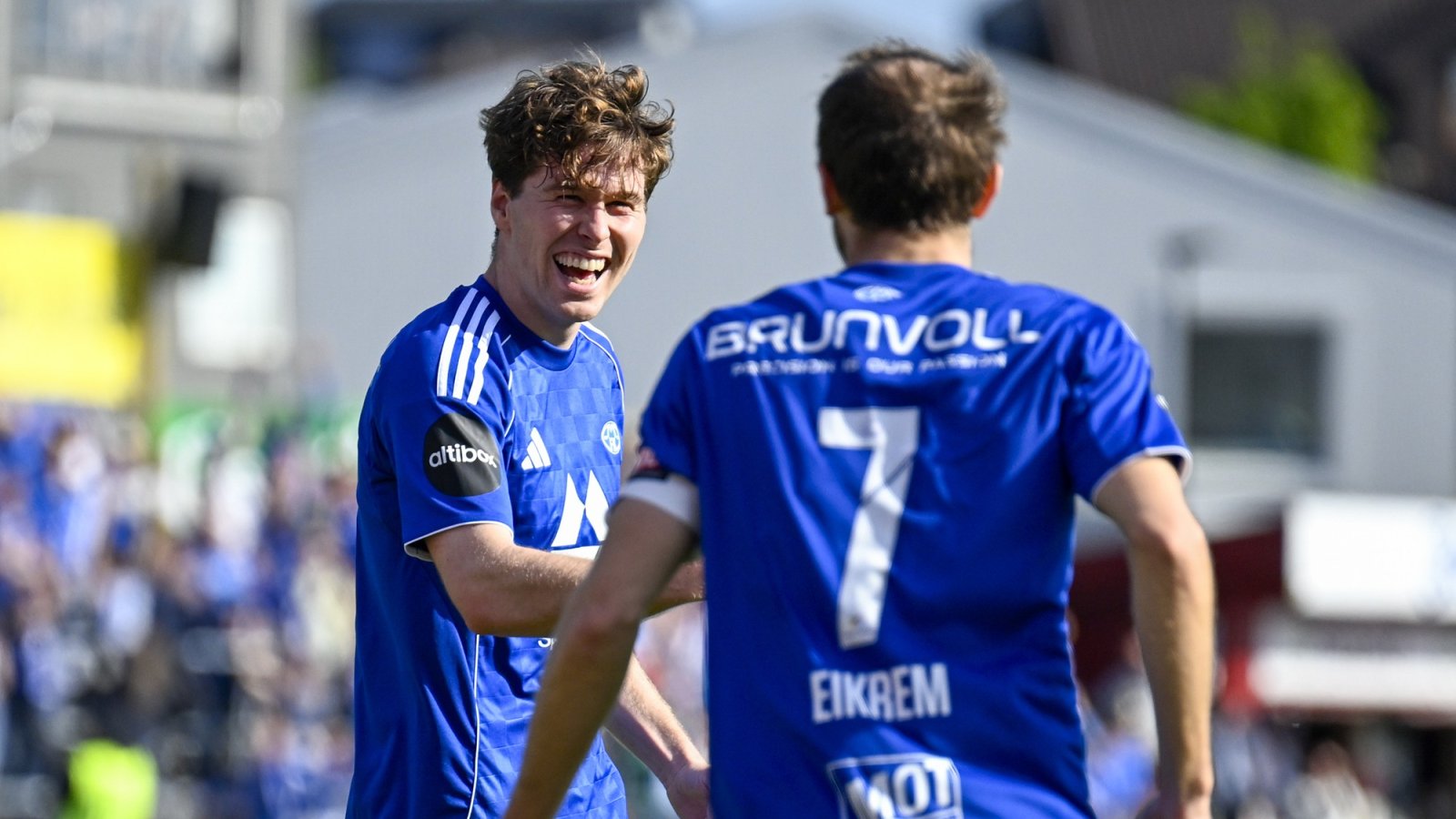 BILDET: Emil Breivik ble dagens mann med tom flotte scoringer. Her er det skryt å få av kaptein Magnus Wolff Eikrem. Foto: Carina Johansen / NTB