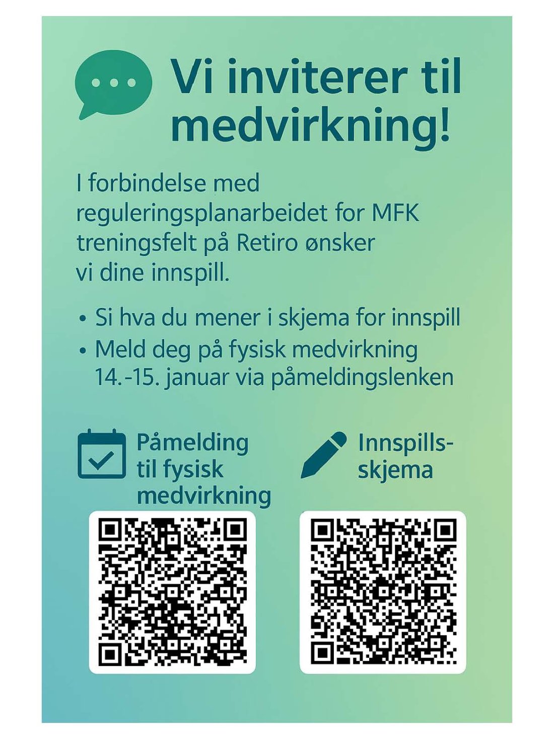 - Digitalt innspillsskjema (åpent for alle og tilgjengelig fra 1. desember til 15. januar) Se QR-kode nedenfor.
