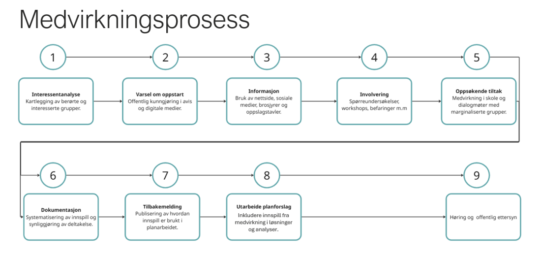 Perioden for medvirkning varer fra 24. november 2025 til 15. januar 2026. Stegene i medvirkningsprosessen er illustrert i figur nedenfor.
